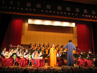 佛光山人間音緣梵樂團「禮讚音緣巡迴音樂會」表演列車,於十五日晚駛抵南華學館,前來聆賞的民眾大爆滿,八樓表演廳座無虛席,近百位無座民眾則在五樓觀賞現場直播。合奏、琵琶獨奏、二胡獨奏、梵唄讚頌團唱誦…梵樂團精采的表演震撼人心,讓大眾度過一個歡喜的音樂饗宴。