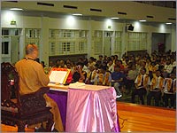 心定和尚首先吟唱「佛祖保佑你」歌曲,帶動現場輕鬆氣氛,並以幽默風趣、生動易懂的生活真實故事,說明因緣果報、善惡循環的關係。人人追求吉祥,就要做到不自私、不貪色、不批評、知足常樂,能相互尊重、相互信任、和平相處,就能達「共生吉祥」境界,使社會安和樂利。