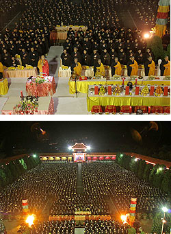 「佛光山萬緣水陸法會」7日清晨4:00於大雄寶殿丹墀舉行小齋天佛事,由宗委會主席心培和尚主法,法會備辦以豐盛佳餚宴請三寶及諸天,5000餘人排滿於成佛大道四周,法會直至6:00圓滿。上午8:00內壇舉行告赦佛事,請使者將赦書、赦牒分送諸天,讓六道群靈前來應供;隨後舉行佛供佛事。下午1:00請下堂佛事,奉請下堂14席前來領受水陸大齋。晚上幽冥戒,由定和尚主法,大眾誠心觀想,為六道群靈皈依三寶、施受五戒。